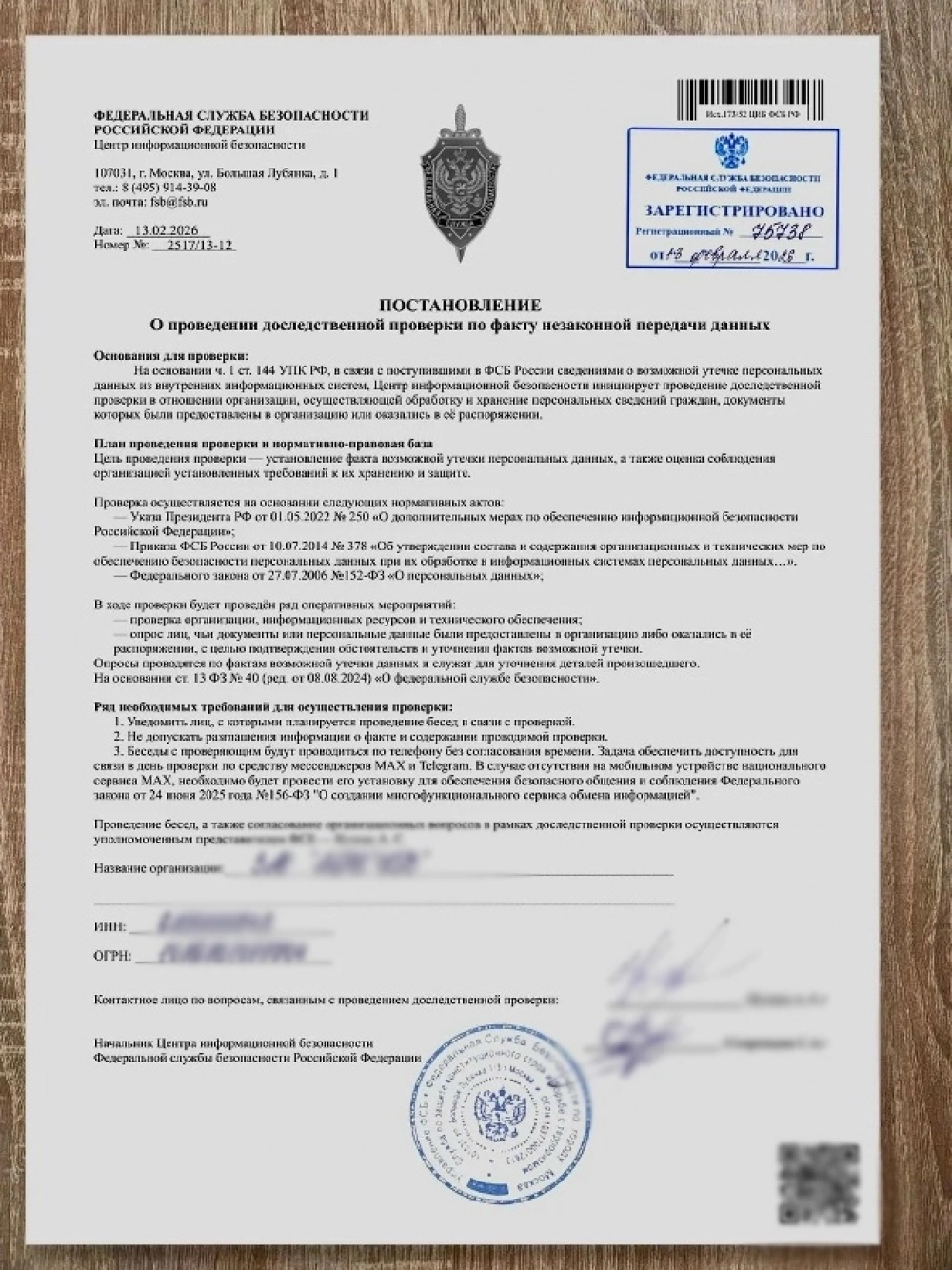 И высылает этот документ, а именно — постановление о проведении доследственной проверки по факту незаконной передачи данных. Очень качественно подготовленный документ.