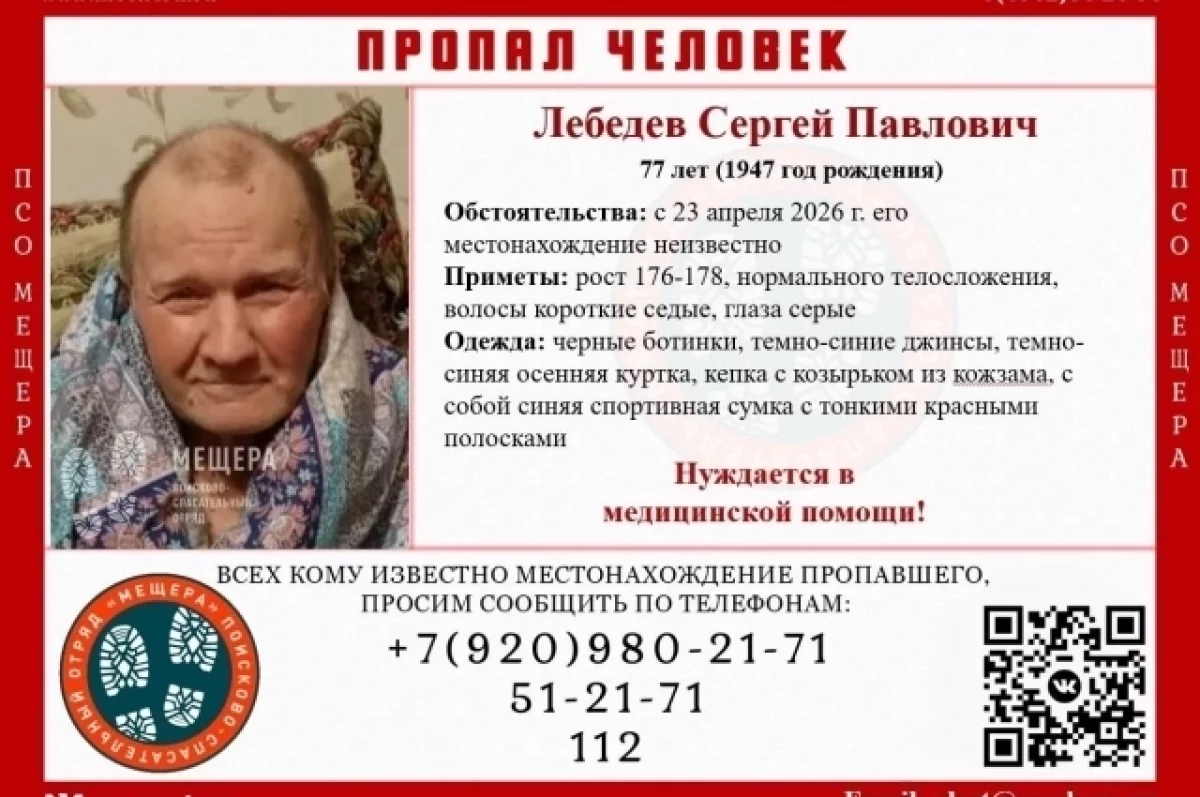 Лебедеву Сергею Павловичу 77 лет, он родился в 1947 году. С 23 апреля 2026 года его местонахождение остается неизвестным.