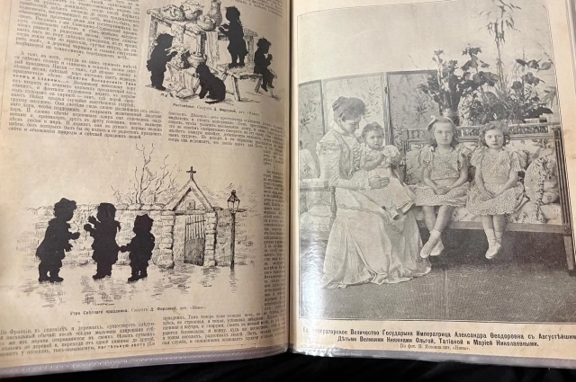 Ну и как накануне светлого праздника не показать семью императора? Фото В. Ясвоина «Ее Императорское Величество Государыня Императрица Александра Федоровна с Августейшими Детьми Великими Княжнами Ольгой, Татьяной и Марией Николаевными» — в самом центре журнала.