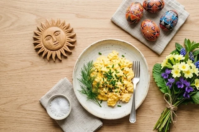 Главным блюдом всегда была яичница — символ солнца. Также приветствуются круглые караваи, блины и всё, что напоминает о тепле и свете.