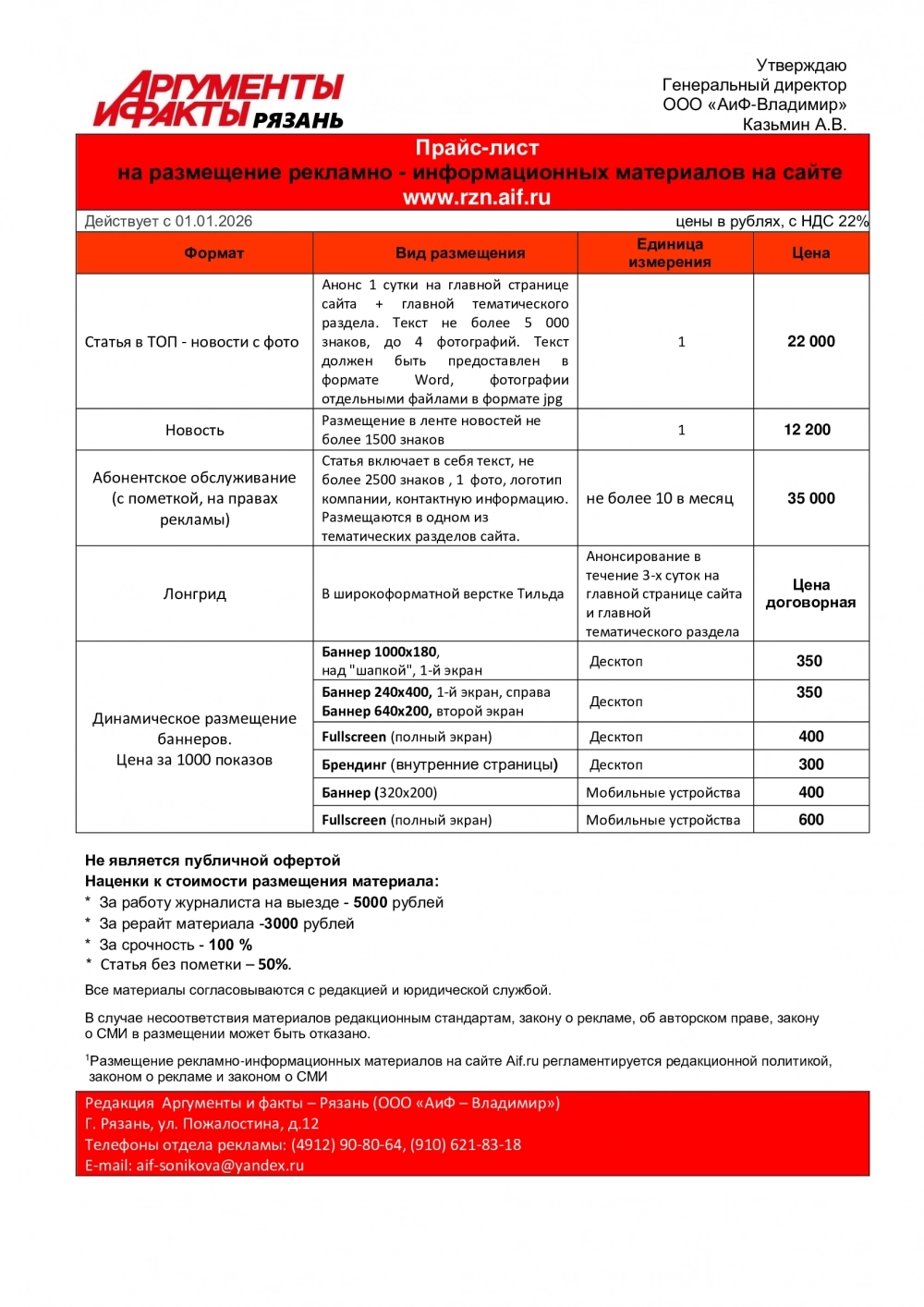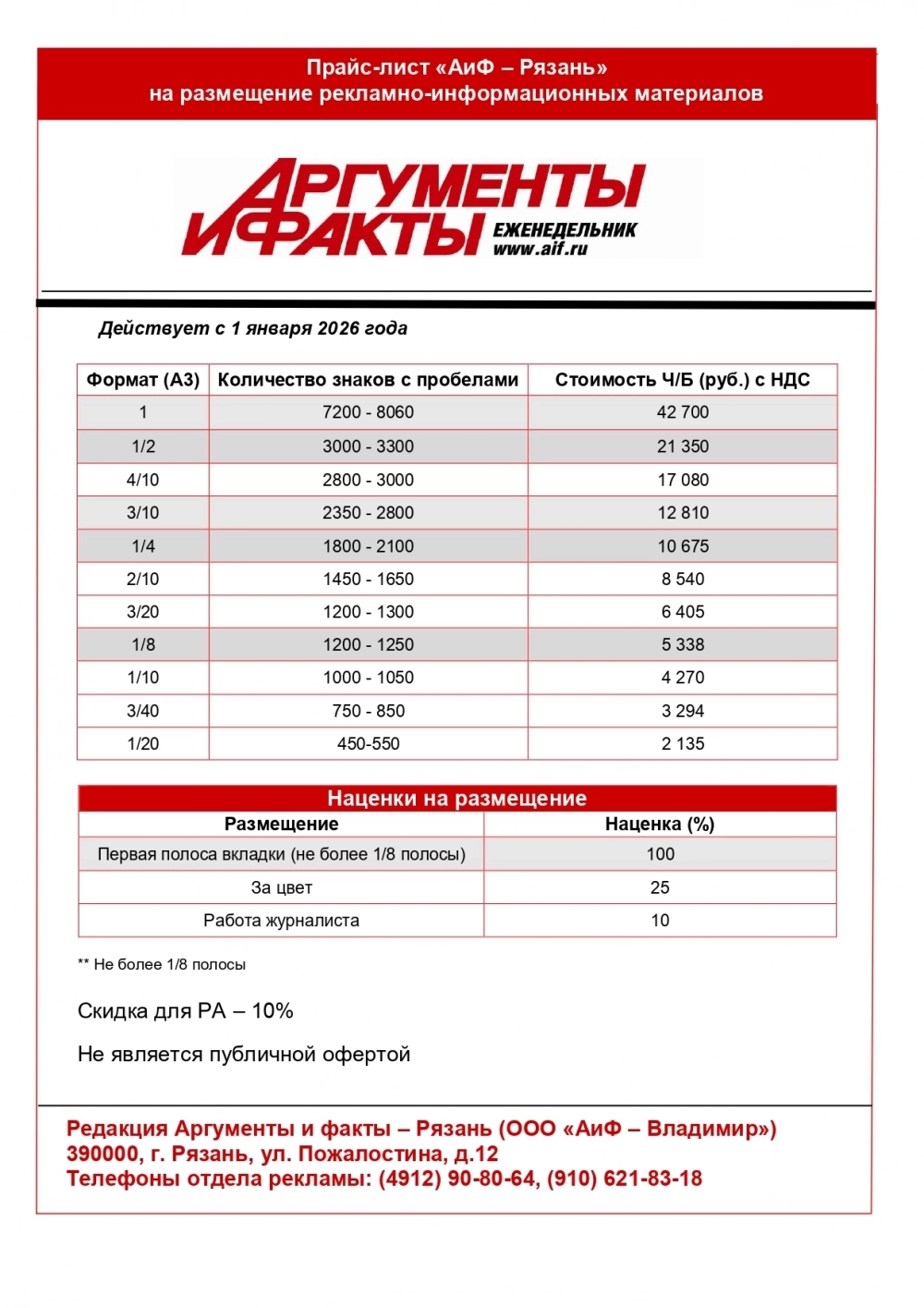 Прайс-лист на размещение в еженедельнике «АиФ-Рязань»